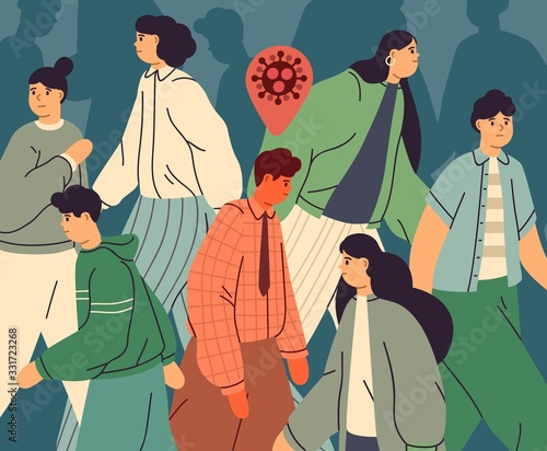 Infected Person Among Healthy People Crowd Of Men And Women In The City During Virus Epidemic Outbreak Coronavirus Pandemic Disease Transmission Vector Illustration In Flat Cartoon Style Buy This Stock Vector